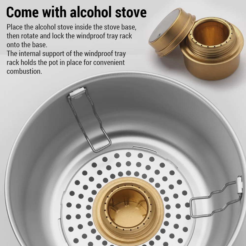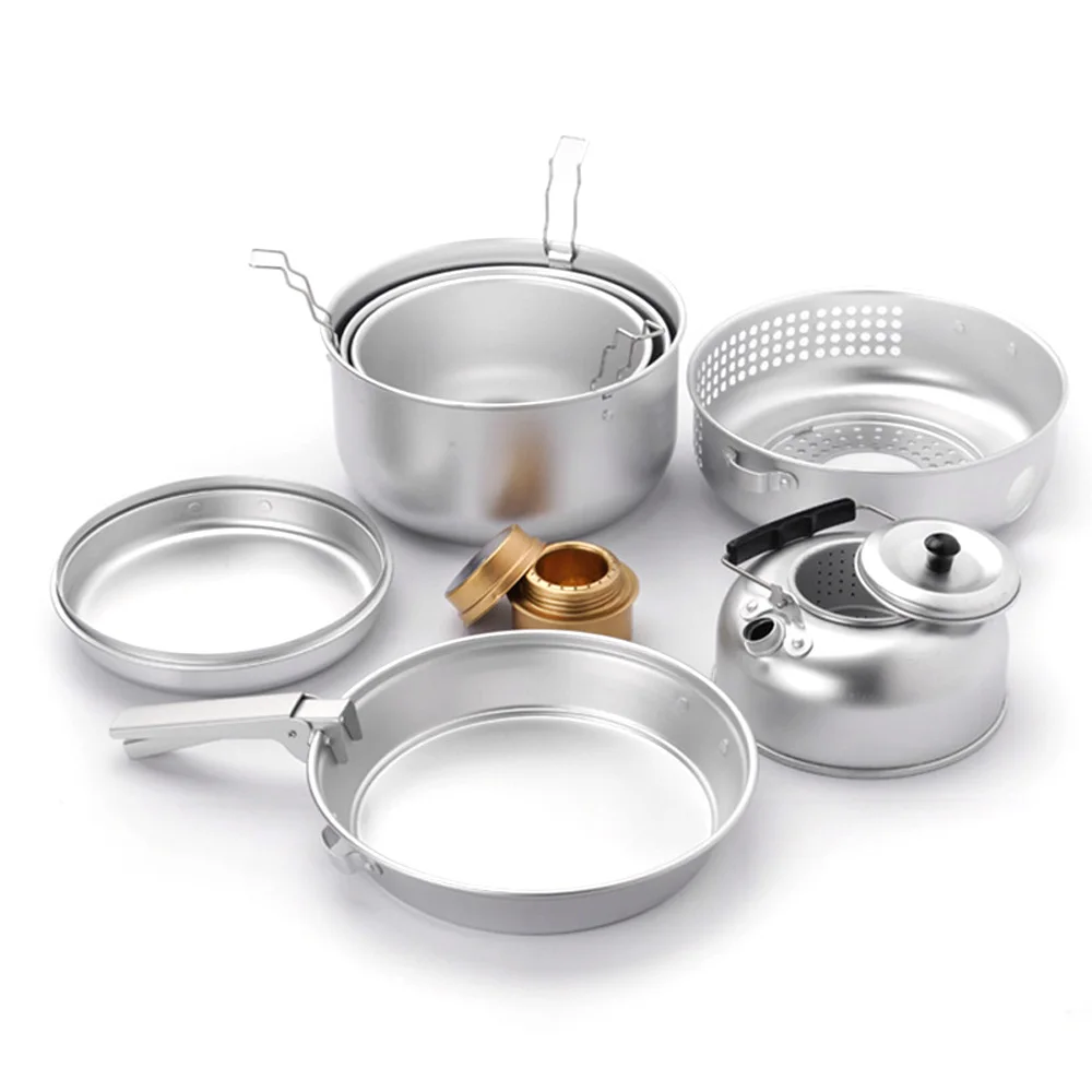- Complete 10-piece set: Includes all the essential cookware for outdoor cooking, such as a frying pan, small frying pan, large pot, small pot, kettle, alcohol stove, windshield, stove base, hand vice, and fastener strap.