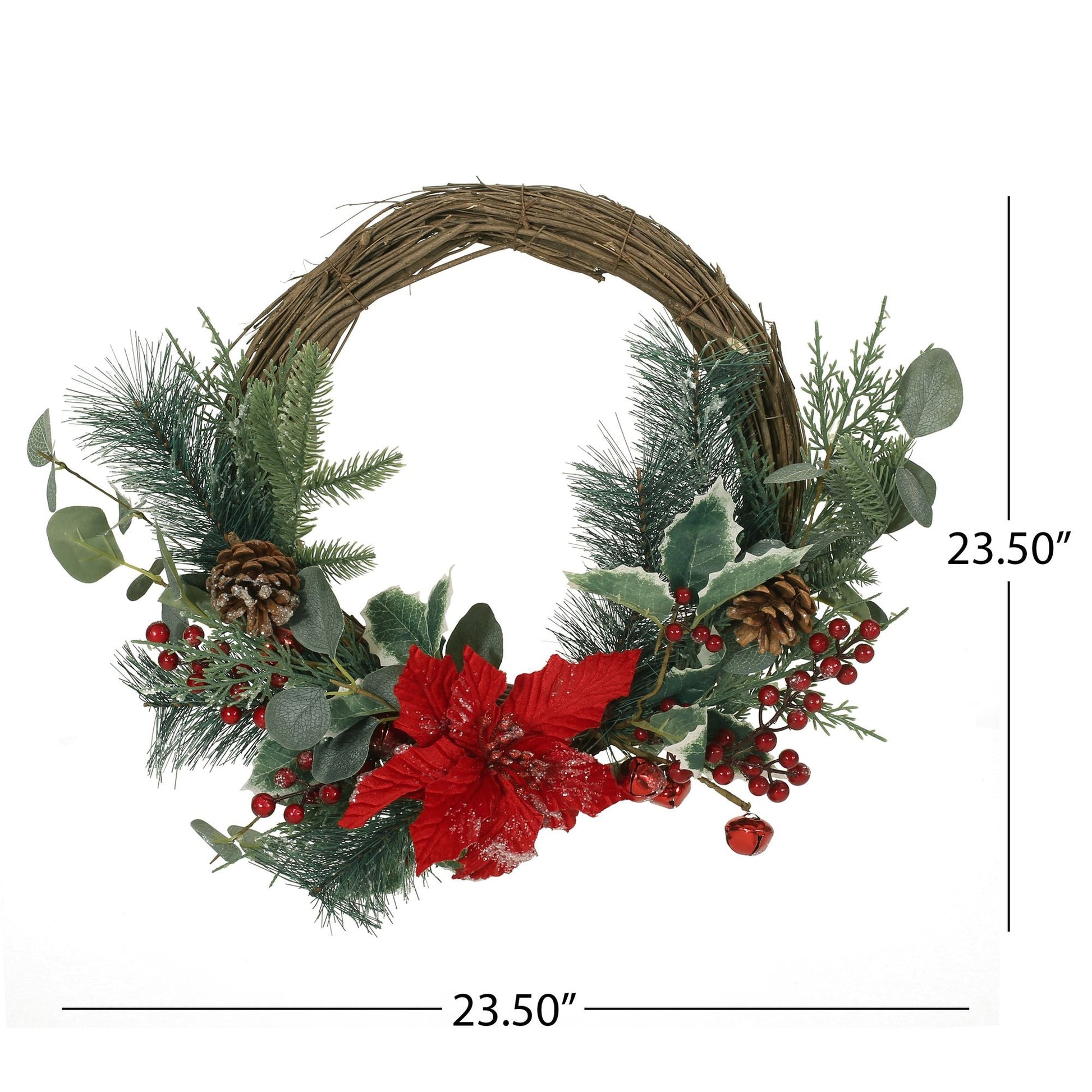 Couronne de Noël Poinsettia & Eucalyptus de 23,5 pouces – Baies rouges vives, parfaite pour la porte d'entrée, décoration de Noël 2024