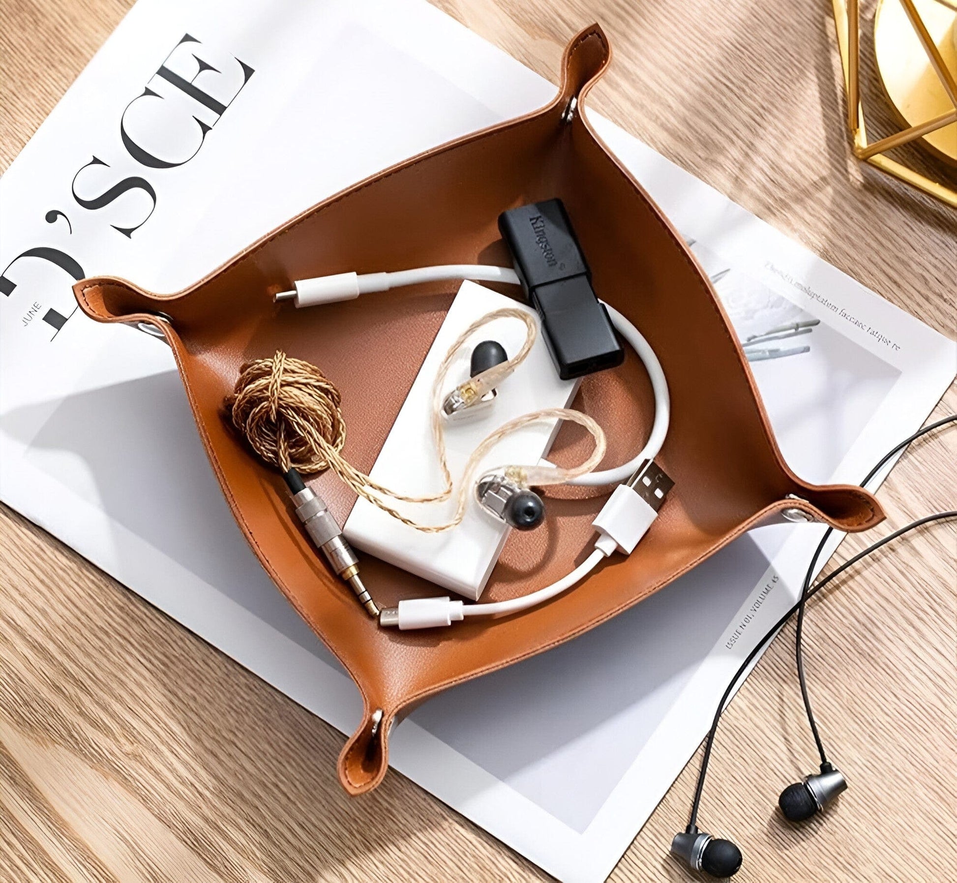 Keep your essentials organized in style with our Leather Tray Catchall Storage Box, a sleek and sophisticated solution for tidying up your space. Crafted from high-quality leather, this tray features a spacious interior perfect for storing keys, coins, jewelry, and other small items.