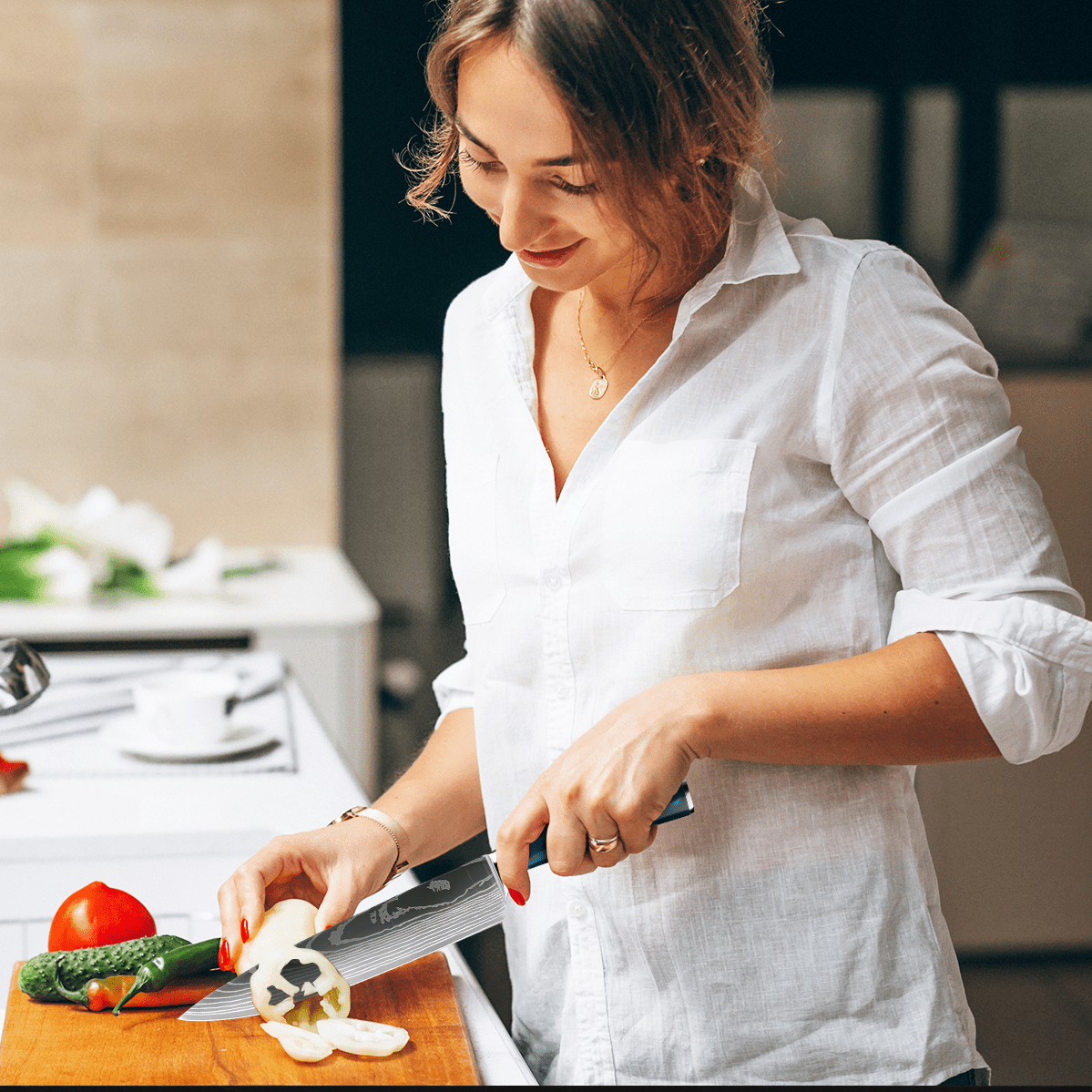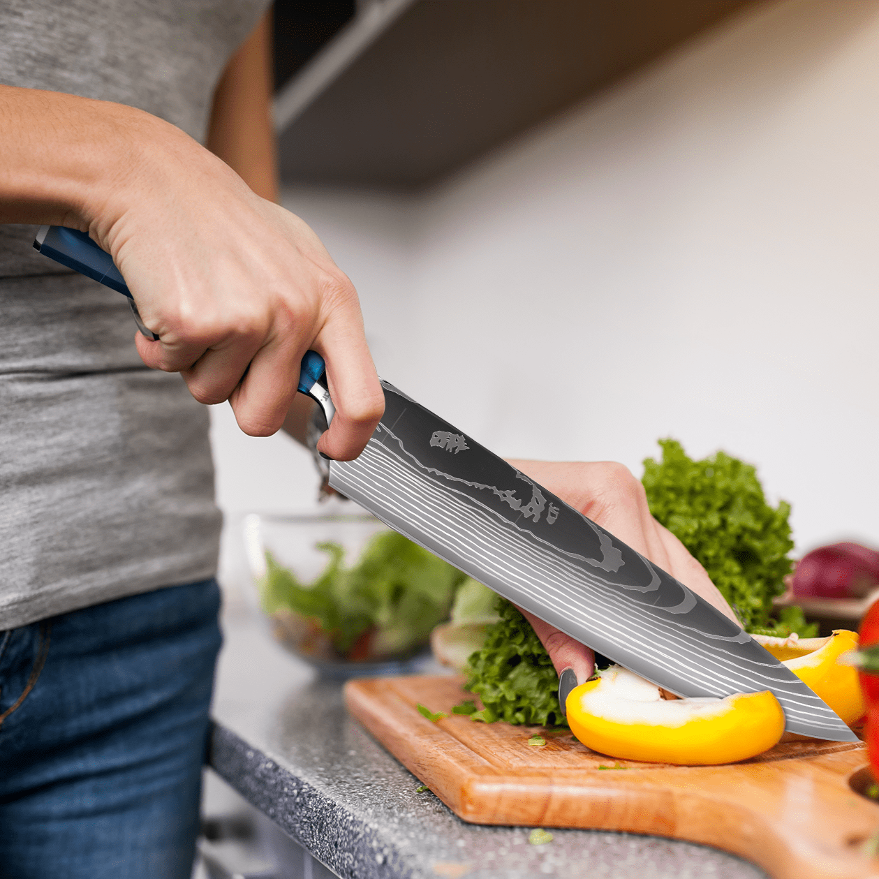 Le couteau de chef japonais en acier damassé fusionne méthodes ancestrales et avancées contemporaines dans un seul instrument de cuisine. Avec sa lame ultra-aiguisée et son ergonomie soignée, trancher et préparer vos aliments devient un plaisir. Ce couteau représente bien plus qu'un simple ustensile ; c'est un élément essentiel pour tous ceux désireux d'améliorer leurs aptitudes culinaires. Ajoutez facilement une note distinctive à vos créations culinaires.