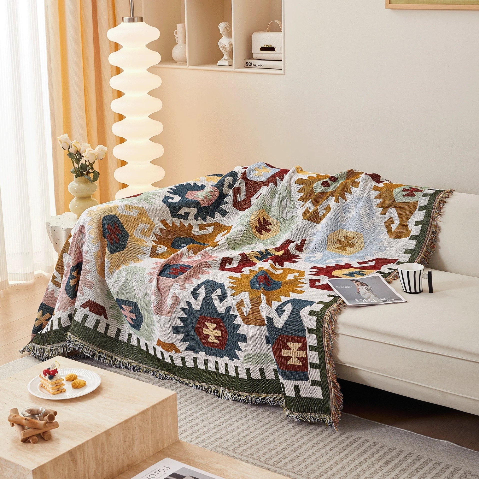 Modèle Réversible: Cette couverture pour canapé présente un design réversible, avec des motifs variés de chaque côté, offrant une expérience visuelle unique. Les franges tricotées de la couverture utilisent une technologie d'impression réactive, assurant des couleurs éclatantes qui résistent à la décoloration.