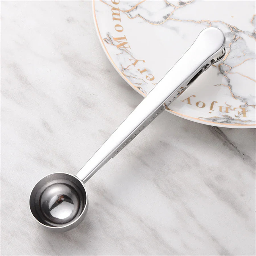 Accessoire doré chic qui fonctionne non seulement comme une cuillère à mesurer pour votre café favori, mais qui permet également de sceller hermétiquement les sachets de snacks, maintenant ainsi vos aliments frais et délicieux.
