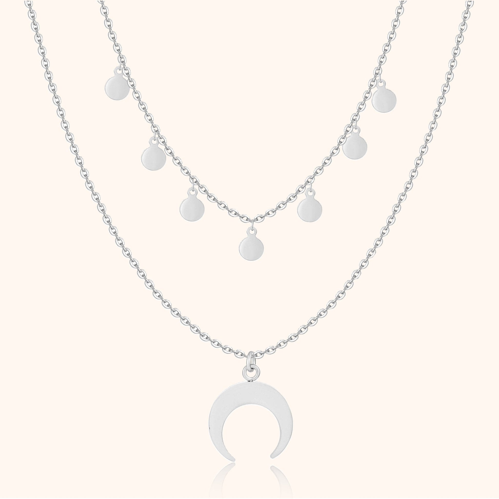 Notre collier double Luna est un accessoire chic et élégant qui se compose de deux niveaux. L'un des colliers présente un délicat croissant de lune, tandis que l'autre est embellie de petits cercles. Confectionné en argent sterling de qualité supérieure et disponible en argent ou en finition dorée 18K, ce collier offre une esthétique classique et une grande polyvalence.