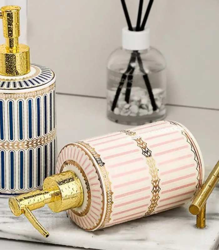 Transformez votre salle de bain avec notre joli distributeur de savon liquide en céramique. Conçu en céramique de qualité supérieure, ce distributeur fusionne harmonieusement un style classique et contemporain. Mesurant 18 cm de haut et avec une capacité pouvant atteindre 500 ml, il allie esthétique et praticité. Son motif fascinant en bleu et or apporte une touche d'élégance à toute salle de bain. Améliorez votre décor avec ce distributeur de savon en céramique au design intemporel.