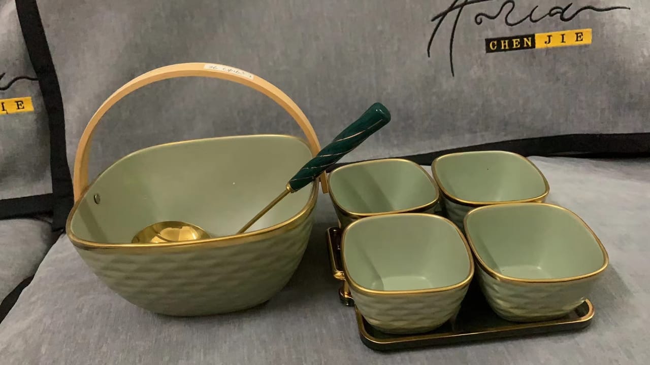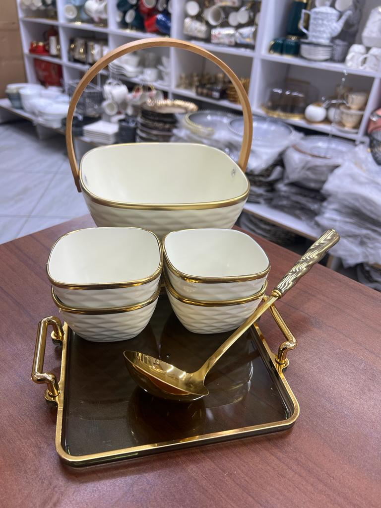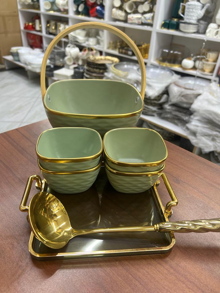 4 coupes, 1 plat en acrylique, 1 cuillère dorée, 1 grand récipient