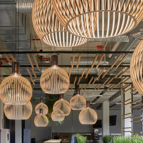 - Plafonnier en bois (naturel) ou en métal (noir ou blanc)
