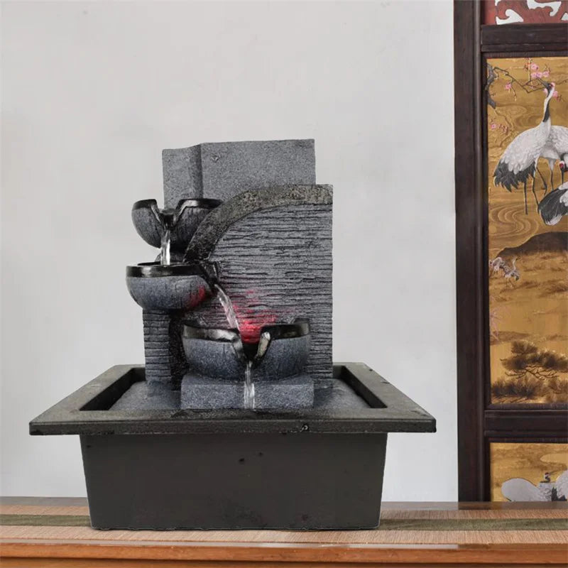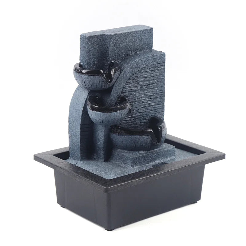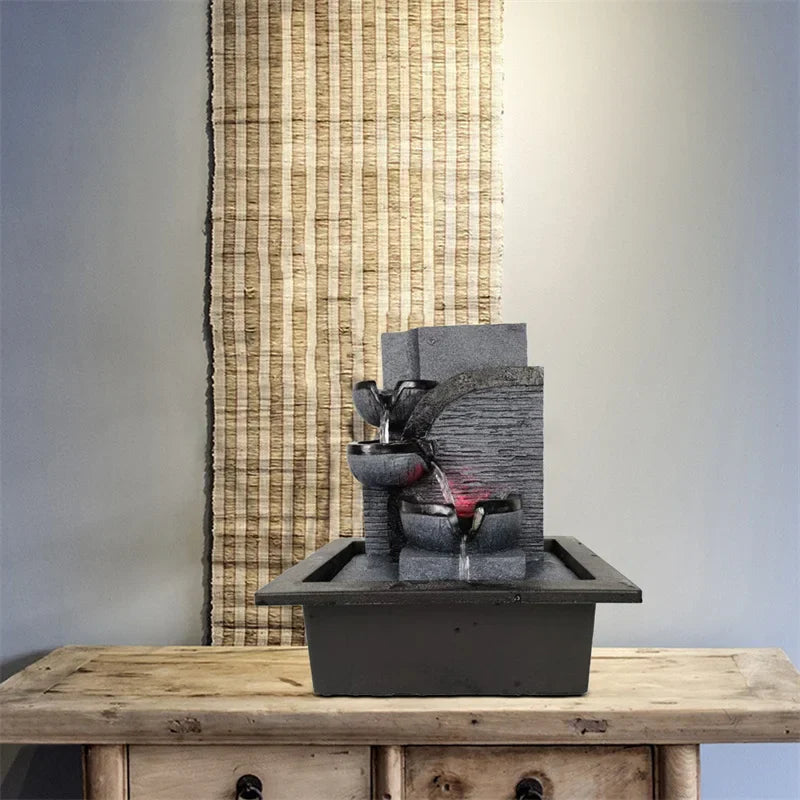 Sons relaxants de l'eau : Le doux bruit de l'eau s'écoulant à travers les formes géométriques de la fontaine évoque une sensation de détente et de calme. Le son aquatique contribue à instaurer un environnement serein et équilibré, aidant à diminuer le stress et à favoriser la relaxation.