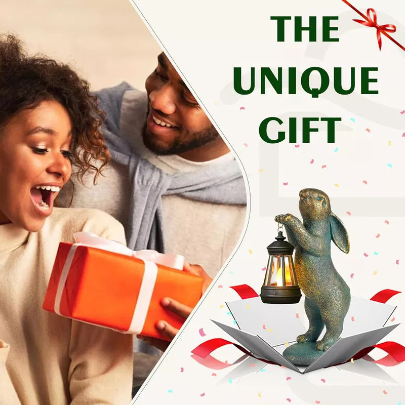 Statue de lapin avec lanterne solaire : Ces sculptures de lapin en bronze portent une lanterne solaire qui projette une lumière douce et accueillante. Cette lumière simule une petite flamme vive et danse sous le souffle du vent. Représentant la chance, la joie et la prospérité, ces figurines de lapin sont parfaites pour instaurer une ambiance conviviale sur la terrasse, dans le jardin ou sur le porche.