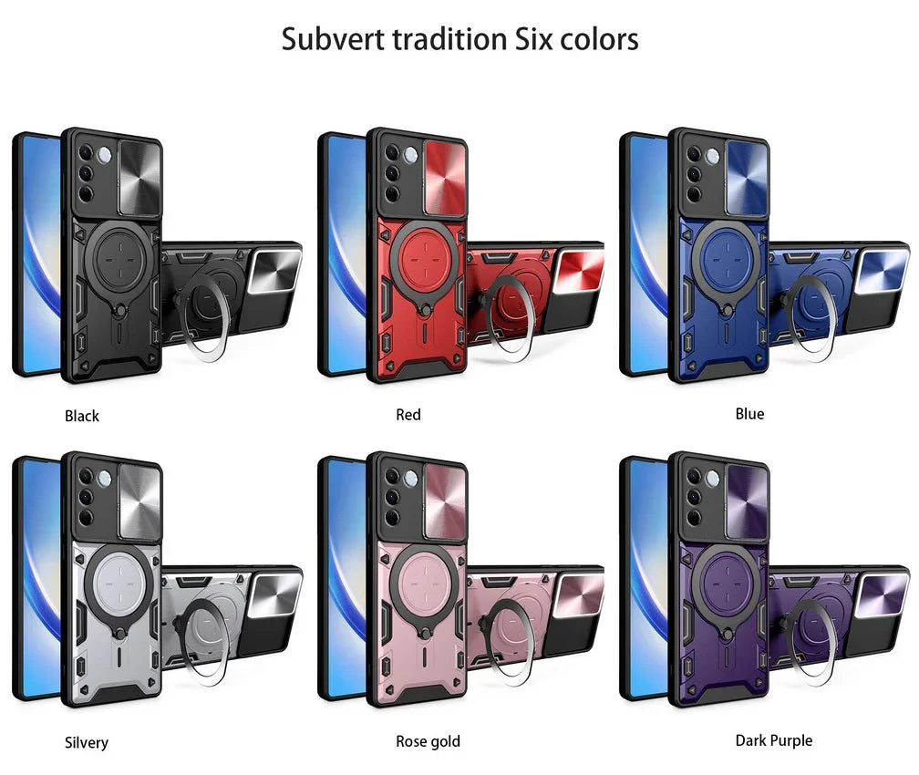 Offrez une amélioration à votre smartphone VIVO grâce à cette coque de caméra coulissante MagSafe haut de gamme, spécialement conçue pour les modèles V27e, V25, V25e, V23, V21, X80 Lite et T1. Équipée d'une couverture coulissante pour la caméra afin de protéger l'objectif, cette coque intègre également un support de bague pratique pour une prise confortable et une utilisation mains libres. La compatibilité MagSafe assure une recharge sans fil simple et rapide, tandis que son design robuste procure une protection efficace contre les chutes et l'usure quotidienne. Combinez praticité et élégance avec cette coque de protection multifonctionnelle.