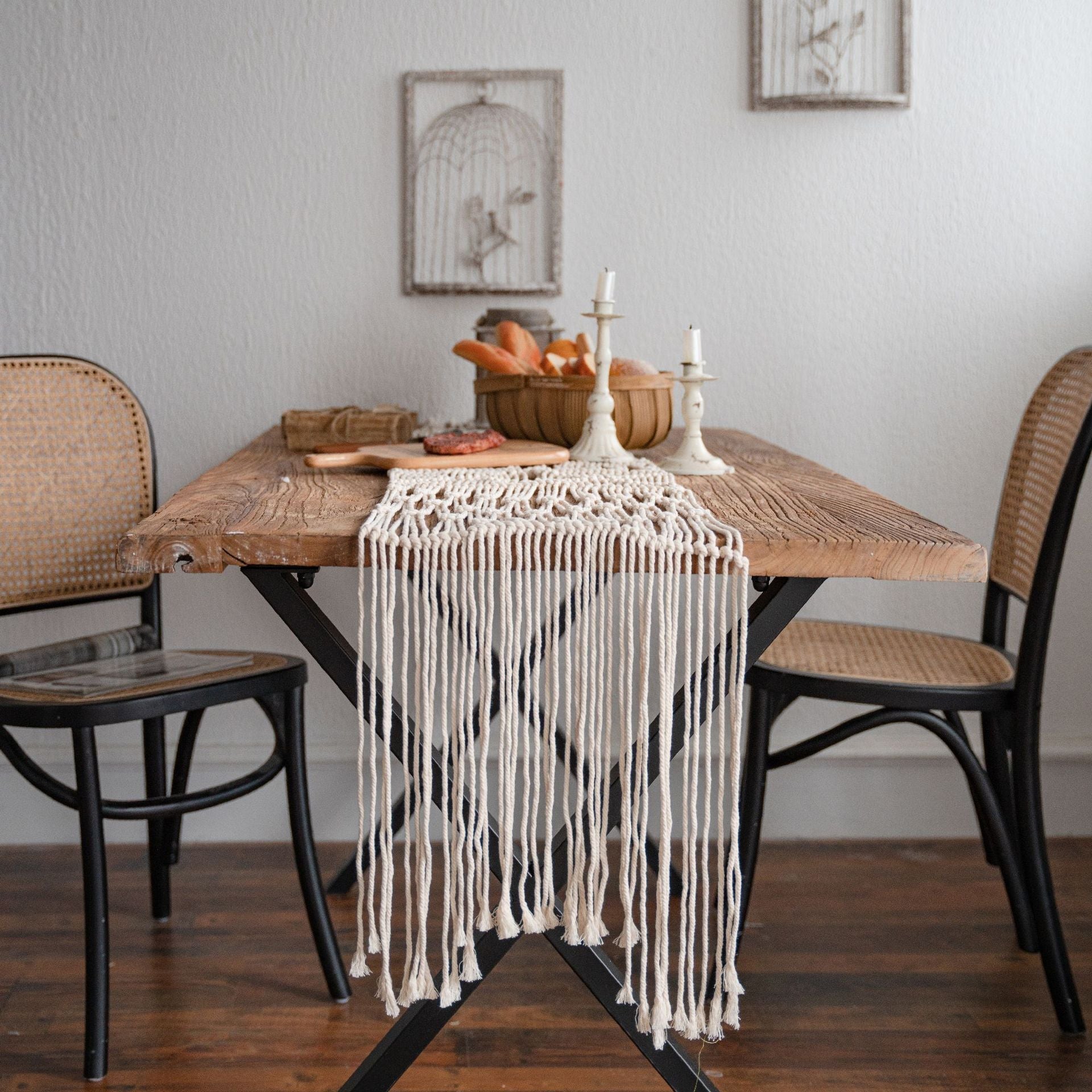 Mélange de Tissu Naturel : Ce chemin de table à franges est tissé dans le style traditionnel du macramé, créant des motifs géométriques captivants.