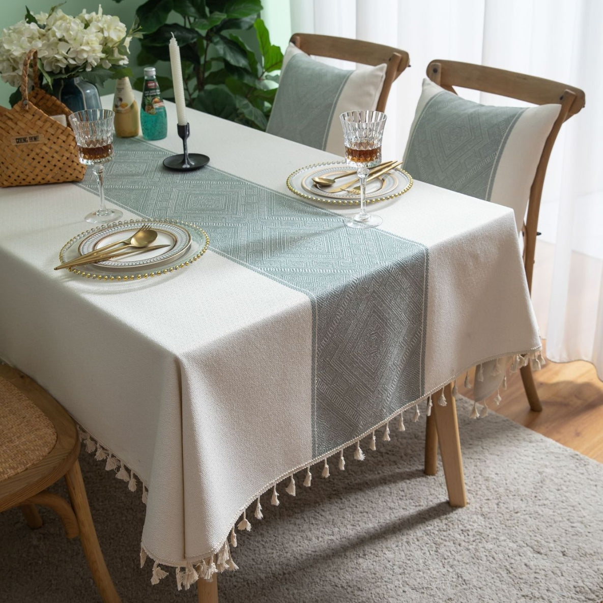 Matériau Choisi: Nos nappes, confectionnées en 100 % polyester, présentent un aspect élégant et raffiné grâce à leur gamme de couleurs apaisantes et leur motif jacquard carré géométrique. Ce tissu reproduit la texture authentique du lin, apportant une touche de sophistication à votre salle à manger tout en bénéficiant de la robustesse des fibres synthétiques.