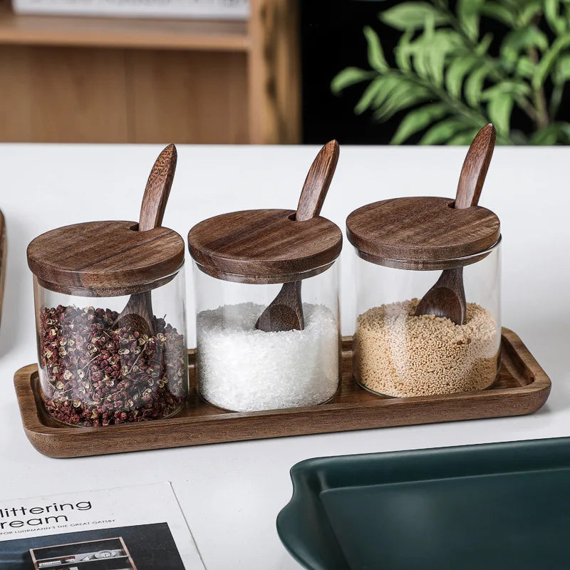 - Ensemble de 3 conteneurs en verre avec couvercles en bois d'acacia