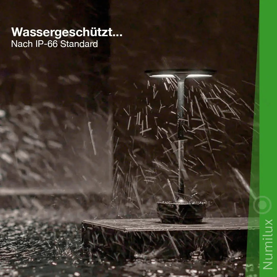 La lampe de table élégante et résistante aux intempéries NumiLux avec batterie constitue un éclairage parfait pour les balcons ou les jardins. Elle est conçue pour résister à la pluie et aux éclaboussures, mais n'est pas conçue pour une immersion dans l'eau.