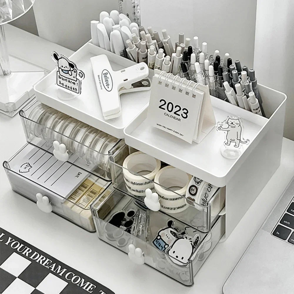 Keep your workspace tidy and adorable with the Minimalist Bunny Desk Organizer. This charming storage set features a sleek, white design adorned with cute bunny handles, perfect for organizing your pens, sticky notes, washi tapes, and other stationery items. With multiple compartments and drawers, it offers ample space to keep your desk clutter-free and stylish. Ideal for students, professionals, or anyone who loves a touch of kawaii in their office.