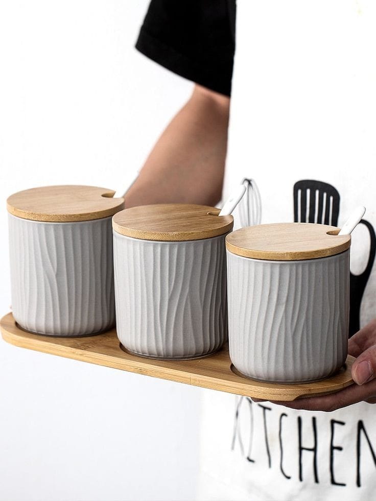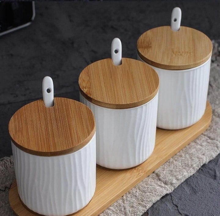 ▫️3 contenants à épices, cuillères en céramique et un plateau en bamboo