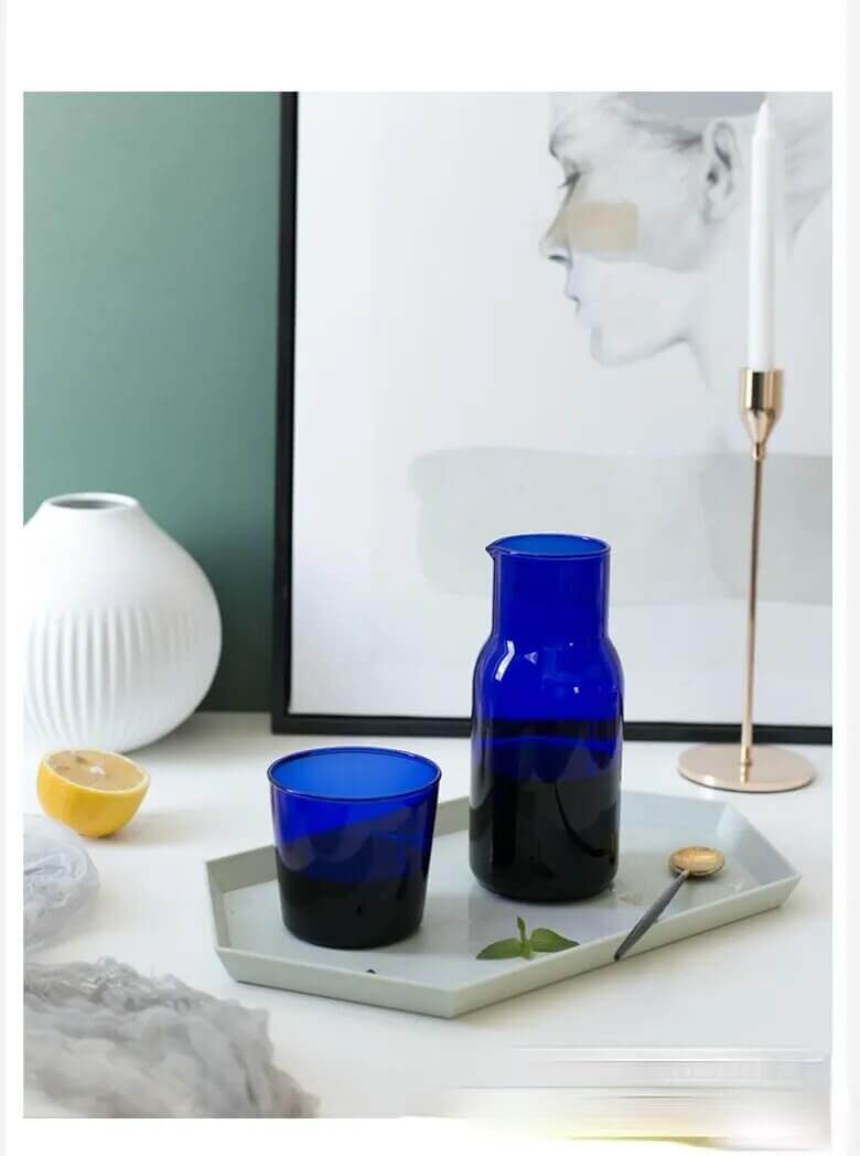 - Design distinctif : L'ensemble de carafes est proposé en quatre teintes différentes (ambre, bleu, vert, transparent), et son design original permet de l'utiliser comme couvercle pour l'eau, ou comme verre pour s'hydrater au cours de la nuit.
